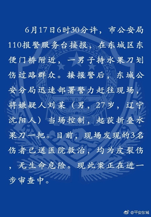 国际在线报道:据北京市公安局东城分局官方微博消息,今早,北京市东城区有一男子持水果刀划伤过路群众,目前已经被警方控制。现场发现的3名伤者均为皮裂伤,无生命危险。