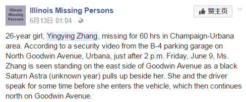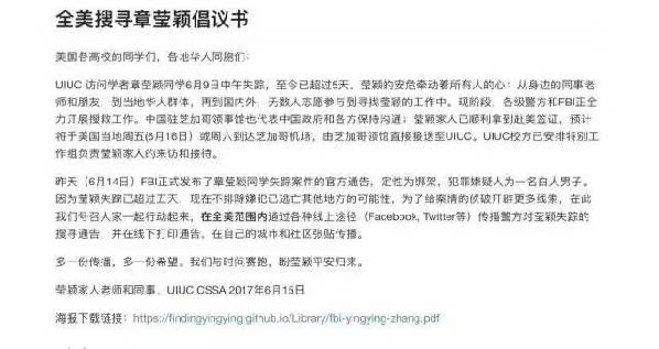 6月15日,伊利诺伊大学华人学生学者联合会(UIUC CSSA)与章莹颖家人、老师、同事联合在各社交平台上发布《全美搜寻章莹颖倡议书》,号召大家在全美范围内扩散警方对中国访问学者章莹颖失踪的搜寻通告。