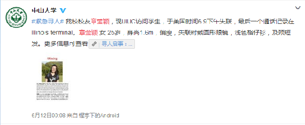 章莹颖失联的消息在6月10日传回国内时便引起网民们极大的关注。中山大学、北京大学、中国科学院、伊利诺伊州大学香槟分校(UIUC)校友会等发布紧急寻人启事,不少网友纷纷转发消息,帮助寻找。