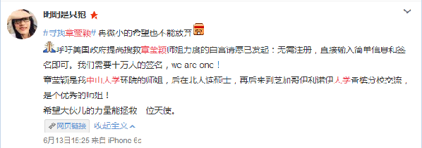 章莹颖的男朋友以及在国内的同学也发动国内外的校友资源,汇总更新最新的搜寻信息,协调国内与美国校友的搜寻工作。