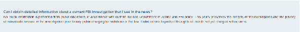 同时,根据美国现行法律和司法部和联邦调查局的政策,FBI参与调查的案件信息不受侦查公开原则的影响。这项政策指在任何公开指控违反法律的情况下,都保留了参与调查的个人的调查和隐私的完整性。