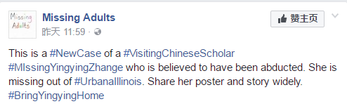 在Twitter、Facebook等社交网站上,转发章莹颖失踪信息的主力是中国留学生和部分州的失踪人口发布账号。