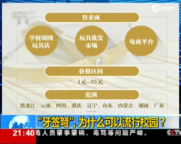 我们来看它的一个状况,售卖商,然后在学校周围的玩具店里头、玩具批发市场、电商平台上都可以去找到它,价格的区间一块钱到三十五之间,显然针对的就是孩子们。而且一个特别加之引号,“有趣”的这种现象是当开始被禁了,开始被查了之后,人家价格反而却上涨了,不好买嘛。然后范围你看波及从北:黑龙江,到南:云南、四川,从西:重庆、辽宁,到东:山东、内蒙古、湖南、广东等等,很多的地方都有,孩子甚至可以说是非常流行,这流行可就意味着一种非常大的风险,幸亏这两天,尤其从今天开始已经进行严查了。