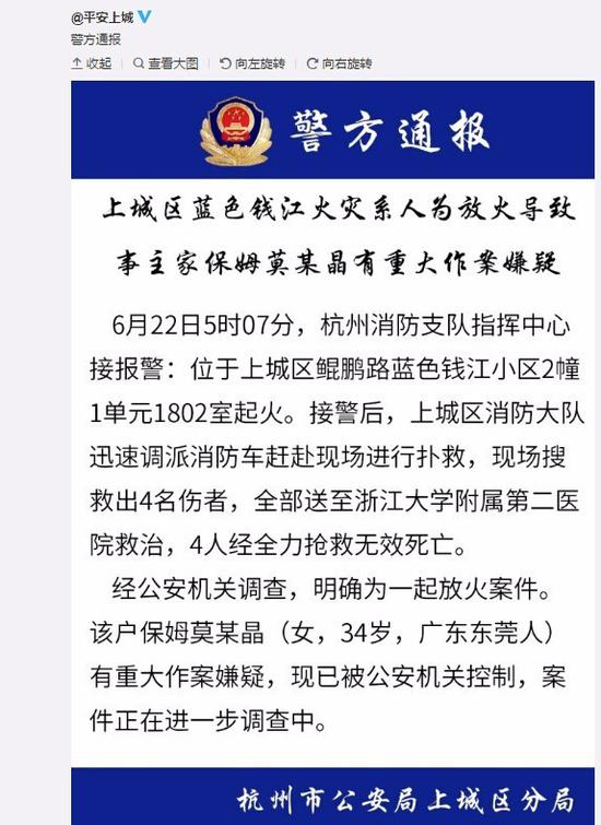 原标题:杭州豪宅火灾系人为放火 保姆交代犯罪事实