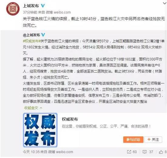 据@上城发布官方微博消息,关于蓝色钱江火情的续报,截止10时45分,蓝色钱江火灾中另两名伤者经抢救无效死亡。
