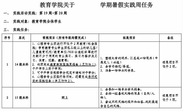 成都文理学院(原四川师范大学文理学院)教育学院的暑假实践任务表(部分内容)。成都晚报 图