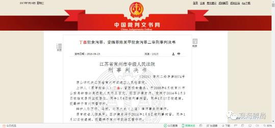 2015年6月26日,武进区人民法院对该案作出一审判决,认定丁鑫共同及单独贪污公款240.69万元,个人实得221.66万元;犯贪污罪判处有期徒刑十二年,并处没收个人财产40万元;查清其受贿所得赃款456.22万元,犯受贿罪,判处有期徒刑十三年,并处没收个人财产60万元。两罪并罚,决定执行有期徒刑十八年,并处没收个人财产100万元。