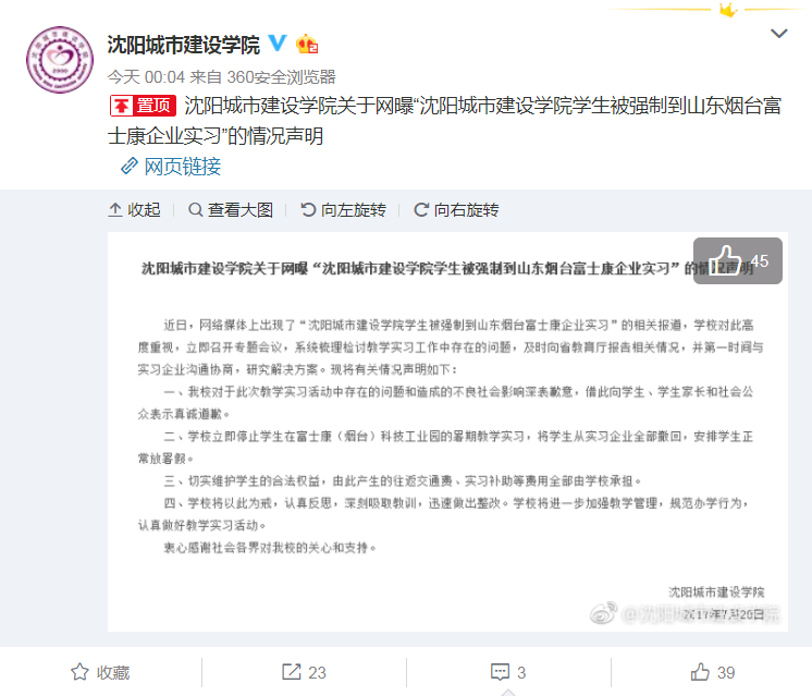 该声明称,近日,网络媒体上出现了“沈阳城市建设学院学生被强制到山东烟台富士康企业实习”的相关报道,该校对此高度重视,立即召开专题会议,系统梳理检讨教学实习工作中存在的问题,及时向辽宁省教育厅报告相关情况,并第一时间与实习企业沟通协商,研究解决方案。