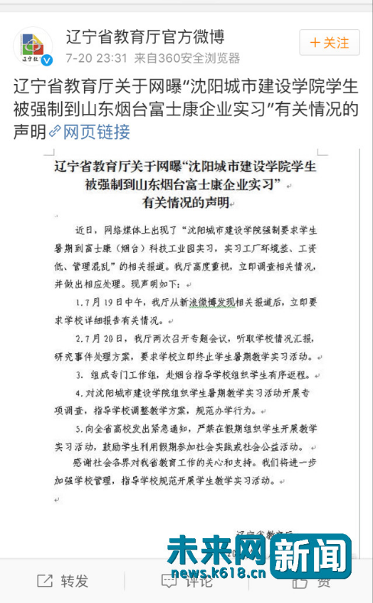 未来网北京7月21日电(记者 廖瑾)20日晚,辽宁省教育厅发布声明,回应“沈阳城市建设学院学生被强制到山东烟台富士康企业实习”一事,要求学校立即终止学生暑期教学实习活动。