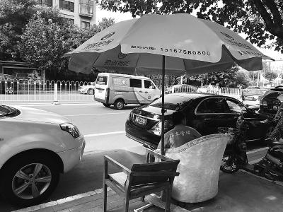 顺着停车带往东走,会看到身穿橙色制服的几名男子骑着电动自行车来回巡视,每当有车从停车位开走,或者准备停车时,他们就会上前,从车的前挡风玻璃取下小纸条,按上面的时间收钱。在这条路中段的人行道上,立着一把黄色的大伞,伞下面摆着两把椅子,一名身穿浅蓝色上衣的男子正在路边喝水,所穿的衣服后背上印着“停车管理”四个字。他告诉记者:“这条路两侧路边停车都是要收费的,第一个小时6元,第二个小时9元。”他说因同村的老乡有事,所以临时来替他上几天班。他指了指头顶的遮阳伞说,这把伞和沙发都是路边一家金融公司提供的。