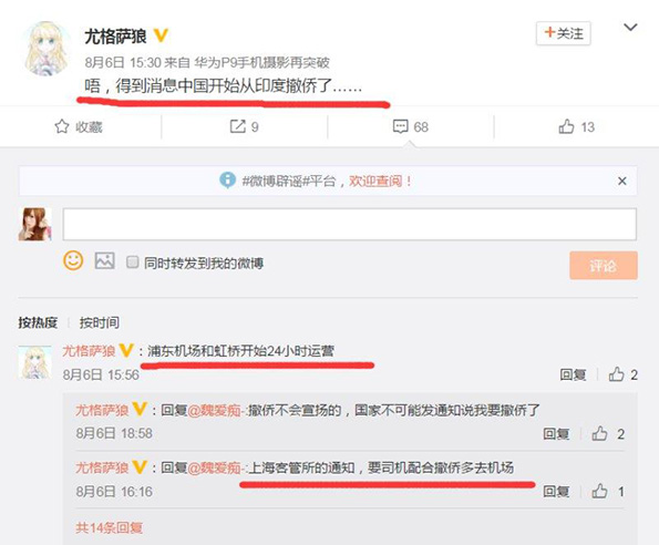 晨报讯“中国开始从印度撤侨了……”8月7日,一则消息从一个名为“尤格萨狼”的新浪微博账号中发出,立即引起网民和新闻媒体的广泛关注。经上海市公安局网安总队查证,该消息系谣言,散布该谣言的网民是22岁的本市居民曹某某。