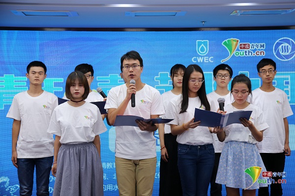 活动现场,来自清华大学、北京邮电大学、北京航天航空大学、北京理工大学、中国石油大学、北京科技大学、北京交通大学等高校学生代表宣读节水倡议书。中国青年网记者 张群摄