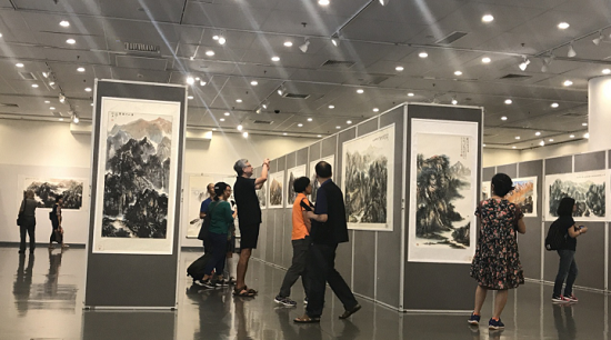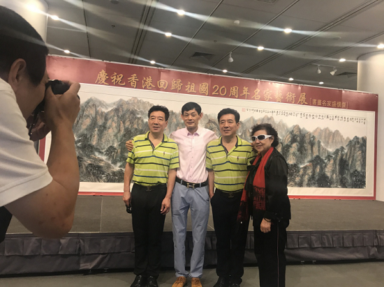 盛怀杰介绍,场中最大的一幅山水作品,描绘的是一条龙脉,其寓意着内地与香港的一脉相承,祝愿两地的未来兴盛和谐。