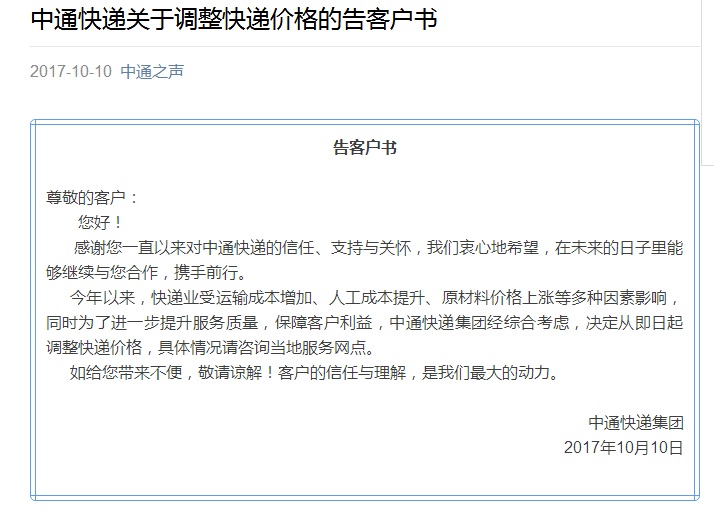 人民网北京10月11日电 (易潇)中通快递集团官方微信号“中通之声”10日发布《中通快递关于调整快递价格的告客户书》称,即日起调整快递价格,具体情况请咨询当地服务网点。