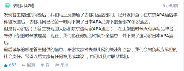 近两日在网上闹得沸沸扬扬的APA酒店“重现事件”有了新转机。有记者在13日16时许登录知乎,发现去哪儿驻知乎官方账号“去哪儿攻略”在知乎答主王瑞扬回答下方的评论区回应道,经排查,在东京APA酒店事件被报道后,去哪儿网已第一时间下架了日本APA品牌下的全部70多家酒店,但有两家店(即答主发现的大阪和东京这两家APA酒店)在上架时没有填写品牌名,导致下架时被遗漏。现在,去哪儿网已经补全信息,并下架了这两家酒店。(环球网)