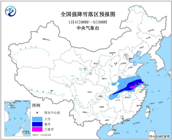 中央气象台1月4日06时继续发布暴雪橙色预警: