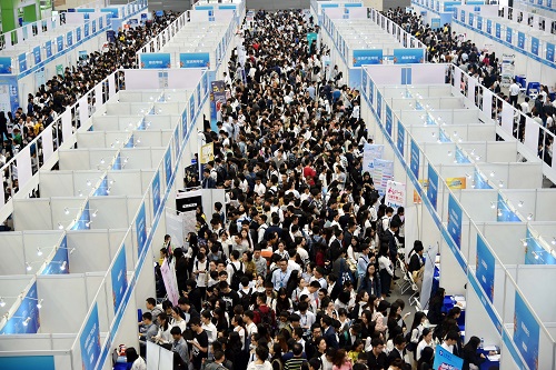 资料图:在深圳会展中心举行的第三届全国高校毕业生春季双选会现场人头攒动 新华社记者 周科 摄