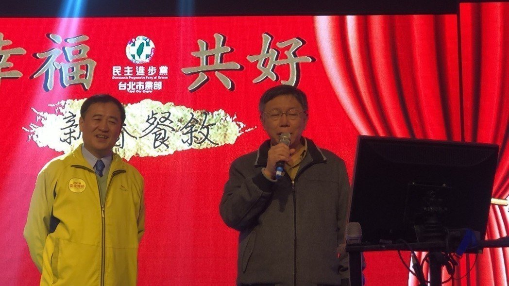 台北市长柯文哲(右)25日在民进党市党部春酒上献唱《挪威的森林》。(台媒图)