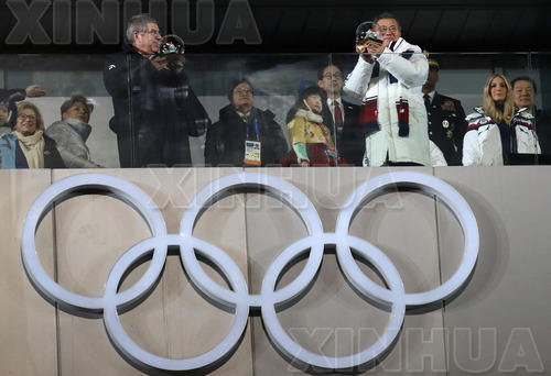 2月25日,韩国总统文在寅(前右)与国际奥委会主席巴赫(前左)在2018年平昌冬奥会闭幕式上。(新华社记者白雪飞摄)