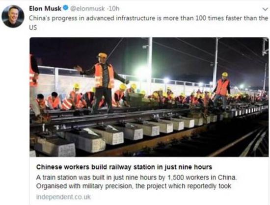 近年来,中国速度日益引发外媒关注。28日,一段中国工人在火车站施工的视频又走红美国,刚刚将跑车送上太空的企业家马斯克(Elon Musk)也忍不住转发赞叹,“中国先进基础设施发展速度比美国快了100多倍”。截至发稿,这条推文获得7千多转发,3万点赞,外国网民也展开讨论,为中国速度点赞。(央广网)