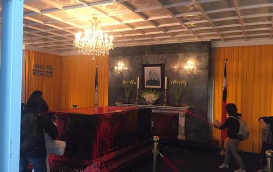 有“独派”团体将红漆泼洒在蒋介石棺柩上。(图片来源:台媒)