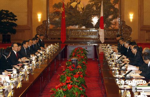 12月28日,中国国务院总理温家宝在北京人民大会堂与来访的日本首相福田康夫举行会谈。 中新社发 盛佳鹏 摄