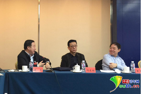 3月9日上午,在工商联小组讨论会上,全国政协委员、新华联集团董事局主席兼总裁傅军(左)为了说明中国亟需振兴民族品牌,不惜抬起手腕“秀”出自己的手表。 中国青年网记者 吴楚 摄