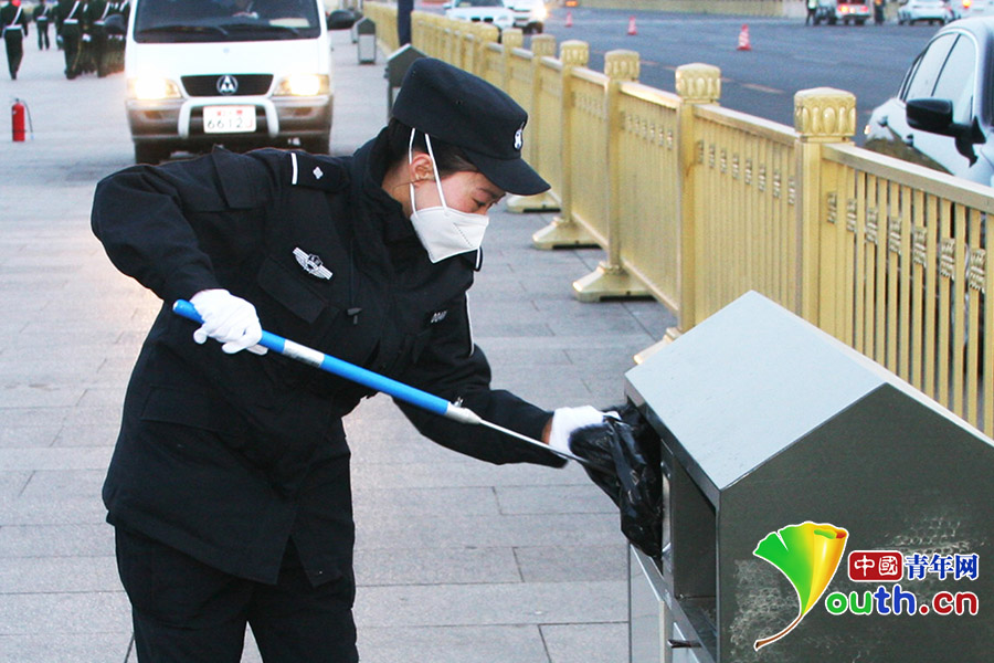 首都特警在天安门广场内检查垃圾箱。北京市公安局供图