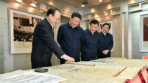 2月19日,中共中央总书记、国家主席、中央军委主席习近平在北京主持召开党的新闻舆论工作座谈会,并到中央新闻单位调研。这是习近平在人民日报社了解人民日报发展历程。新华社记者 李涛 摄