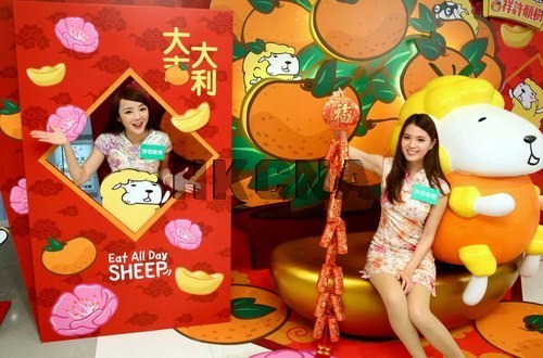 农历新年前夕,香港恒基兆业旗下8大商场打造成新春美食主题游乐园,由泰国人气插画师设计的可爱羊羊主角与顾客畅玩羊世界,送上源源福气。图为沙田广场的贺年景致。香港中通社图片