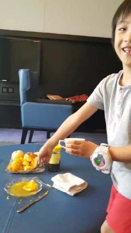 今日,吴镇宇在微博中晒出爱子费曼掉牙后吃水果的照片,并称“牙呢牙呢你牙呢”。照片中费曼穿灰T红短裤,开心吃水果,一脸萌态。