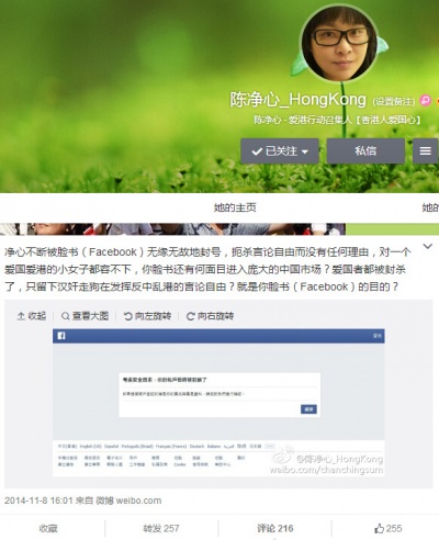 2014年占中期间,陈净心就在微博上透露自己的Facebook帐号被封