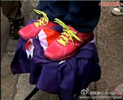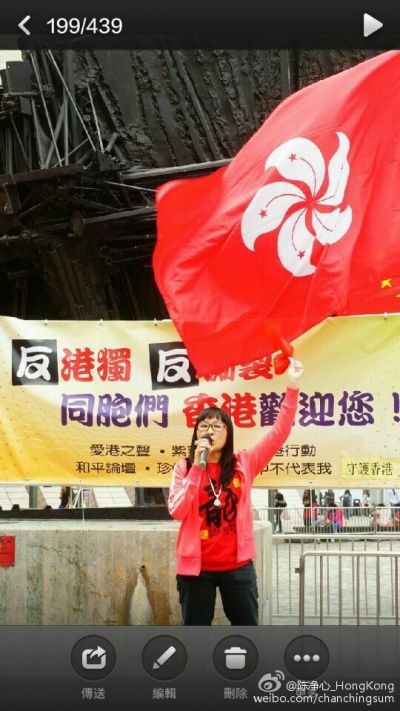 陈净心将“港英旗帜”踩在脚下(来源:陈净心2014年5月5日微博)