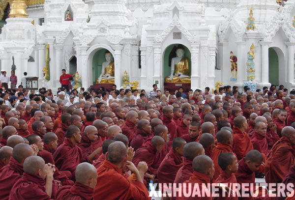 9月24日,在缅甸的仰光,僧侣们参加示威游行。缅甸仰光市数万名僧侣和市民当天走上街头,举行近期最大规模的示威游行。此次示威是自18日以来,仰光僧侣游行的最新升级行动,也是市民首次较大规模参与的示威游行。游行的标语口号是:改善民生、释放政治犯、实现民族和解等。 新华社/路透