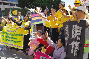 台湾妇女救援社会福利事业基金会国际事务部主任赖采儿一行人专程从台湾赶来参加示威以及研讨会。手举“台湾阿妈要求日本政府谢罪赔偿”牌子的赖采儿说,许多曾经被迫充当“慰安妇”的阿妈都已超过90高龄,因身体虚弱、行动不便而无法来美参加本次活动。她说,台湾目前健在的“慰安妇”大约有25名。