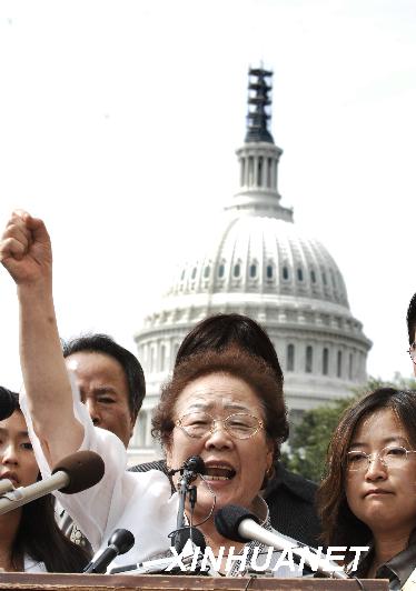 7月30日,曾在二战期间被日军强征为“慰安妇”的韩国妇女李容洙在美国国会前举行的集会上发言。当日,美国国会众议院以口头表决方式,一致通过了一项谴责日本在二战期间强征亚洲其他国家妇女充当日军“慰安妇”的议案。新华社记者张岩摄