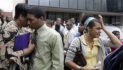 学生家长在得知发生枪击案后,纷纷赶到学校打听孩子的下落。由于警察仍在校内进行调查,他们只能在校外等候。学生们走出校园后,不少人泪流满面,和家长拥抱在一起,也有人双手颤抖地拨打手机和家人联络。