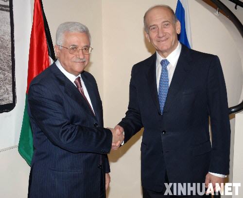 资料图片:9月10日,以色列总理奥尔默特(右)与巴勒斯坦民族权力机构主席阿巴斯在耶路撒冷握手。当天,奥尔默特与阿巴斯和巴勒斯坦过渡政府总理法耶兹在这里举行了会谈。 新华社发
