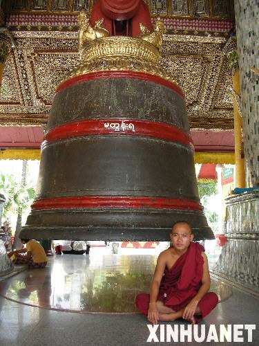 10月20日,僧侣坐在缅甸著名的仰光大金塔内的大钟前。 缅甸警方证实,缅甸已经取消仰光和曼德勒两市自9月25日开始实行的宵禁。 新华社记者 张云飞 摄
