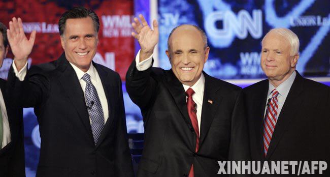 6月5日,前马萨诸塞州州长米特·罗姆尼、前纽约市市长鲁道夫·朱利亚尼、亚利桑那州联邦参议员约翰·麦凯恩(从左至右)在美国新罕布什尔州的圣安塞尔姆学院参加集体辩论。当日,已宣布将参加2008年美国总统选举的10名共和党候选人在圣安塞尔姆学院进行了一场集体辩论。 新华社/法新