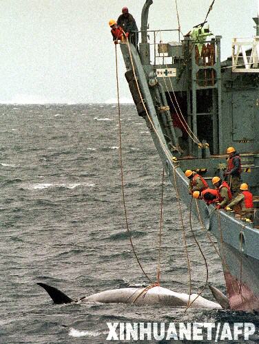 日本政府定于18日开始今年的南太平洋捕鲸活动。同往年一样,日本依旧打起“科学研究”的旗号,但在今年捕杀名单中,座头鲸赫然在列。这将是国际捕鲸协会1963年禁止在南半球捕杀座头鲸以来,首次有国家大规模捕杀这一濒危物种。这是2000年1月12日,日本捕鲸船在南太平洋海域捕获小须鲸的资料照片。 新华社/法新