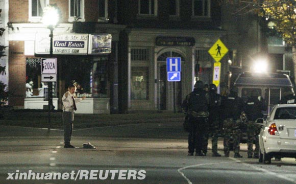 11月30日,在美国新罕布什尔州的罗切斯特,一位名叫艾森伯格的嫌疑人(左)在美国民主党总统候选人希拉里竞选办公室外出现,然后这名男子向警方投降。据美国有线电视新闻网报道,一名自称携带炸弹的男子当天闯入美国民主党总统候选人希拉里·克林顿设在新罕布什尔州罗切斯特的一个竞选办公室,并劫持了两名人质。而希拉里本人当天则不在该州。 新华社/路透