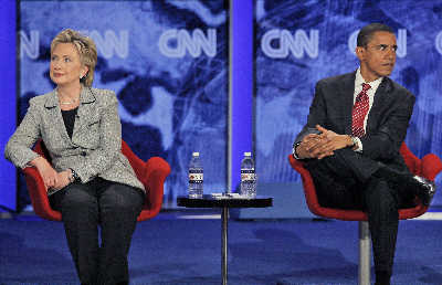 民主党总统候选人希拉里(左)和奥巴马在辩论会上(右)交锋。IC图