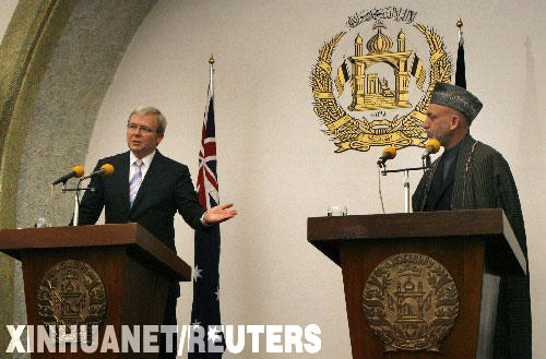 陆克文当天突然访问阿富汗,并与阿总统卡尔扎伊举行了会谈。陆克文在会谈后举行的联合新闻发布会上说,他当天在抵达阿富汗首都喀布尔之前已经视察了澳大利亚驻阿富汗部队。