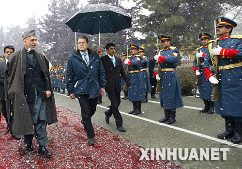 12月23日,在阿富汗首都喀布尔,阿富汗总统卡尔扎伊(左一)和意大利总理普罗迪(左二)检阅仪仗队。新华社记者扎比摄