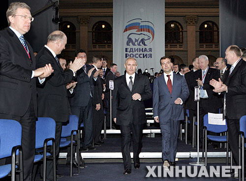 12月17日,在俄罗斯首都莫斯科,俄总统普京(中左)与第一副总理梅德韦杰夫(中右)共同步入统一俄罗斯党代表大会会场。普京当日表示,如果梅德韦杰夫当选总统,他准备出任政府总理。 新华社发