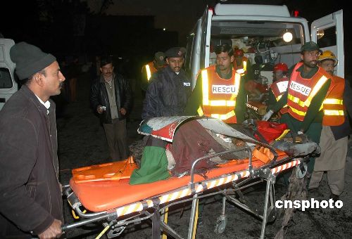 12月27日,临近首都伊斯兰堡,在巴基斯坦东北部城市拉瓦尔品第,发生自杀性爆炸袭击,前总理贝·布托不幸罹难。图为爆炸现场有关人员正在实施抢救。