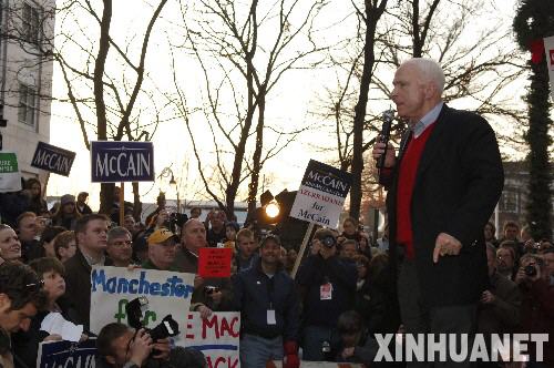 1月7日,美国共和党总统竞选人、亚利桑那州国会参议员约翰·麦凯恩(右)在新罕布什尔州的曼彻斯特发表竞选演说。新罕布什尔州将于8日举行2008年美国总统选举的直接预选。 新华社记者张岩摄