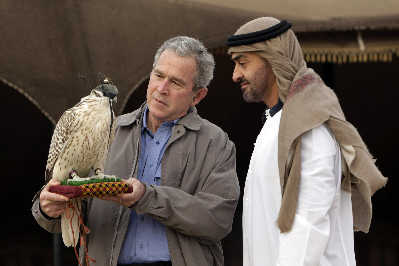 1月13日,阿联酋,到访的美国总统布什和阿联酋王储扎耶德·阿勒那哈扬在皇家俱乐部赏玩猎鹰。