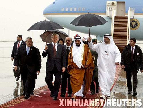 1月13日,阿联酋总统哈利法(中)在阿布扎比迎接刚刚抵达的美国总统布什(左二)。布什当天上午抵达阿布扎比,开始对阿拉伯联合酋长国进行为期两天的访问。阿联酋是布什此次中东之行的第五站。 新华社/路透
